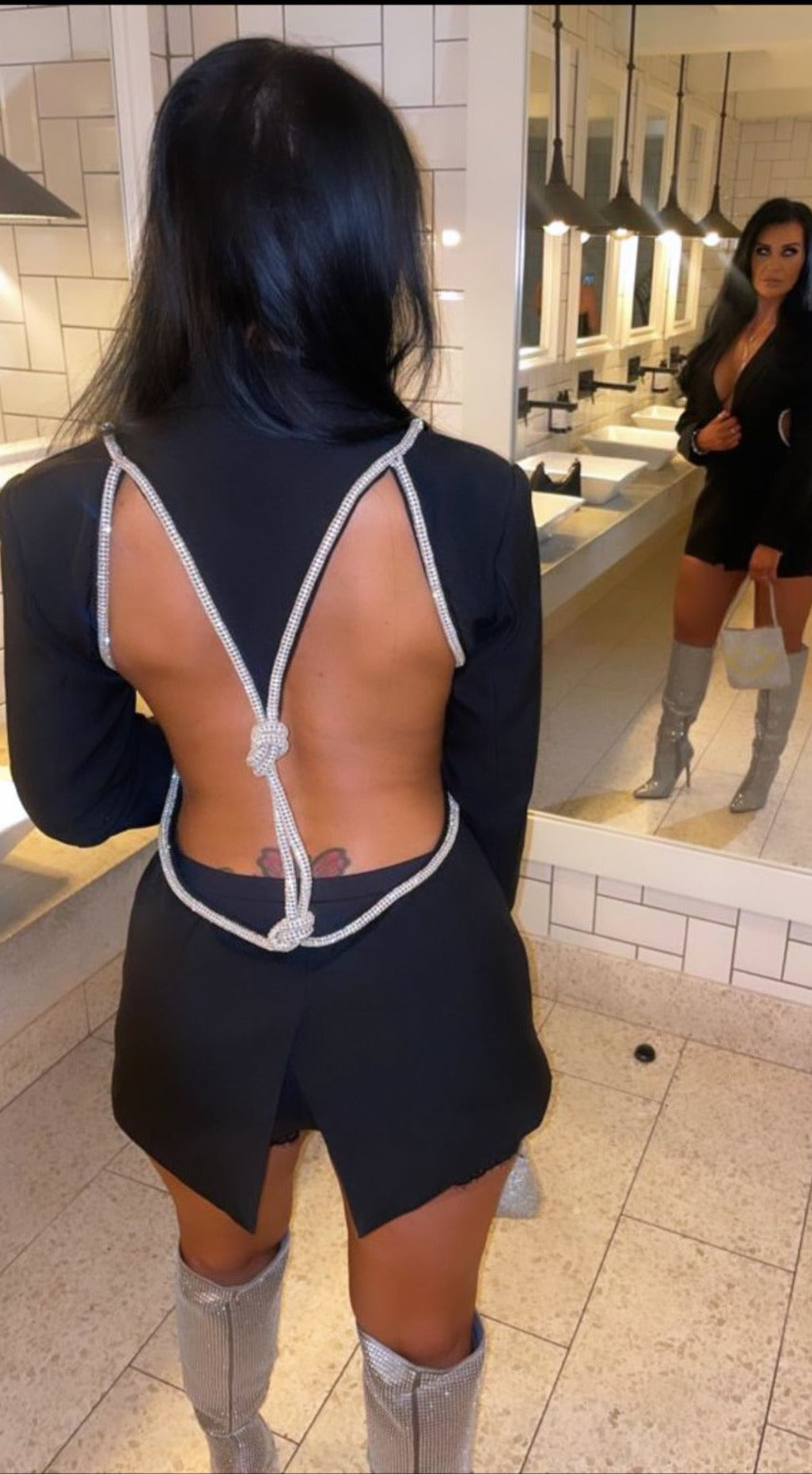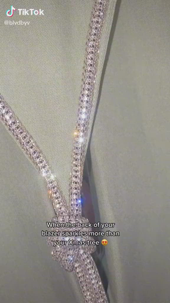 Powder Green or Black with the shiniest diamond drip detail to the open back - this blazer is just something else.