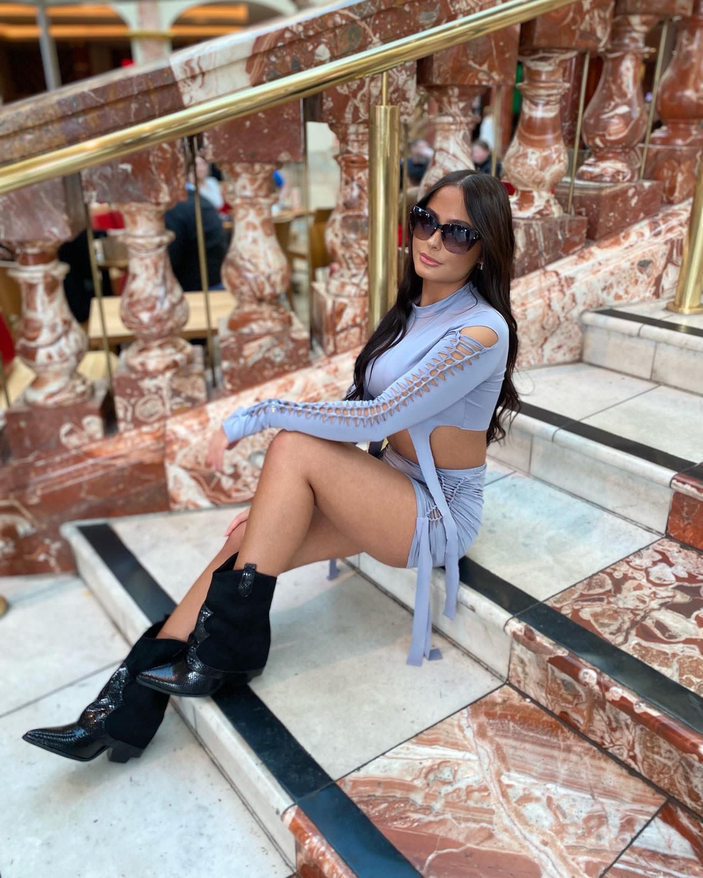 It features an Extra Long Sleeve Crop Top with Thumb Holes for the classy effect and a cut out detail along the sleeves. The Mini Skirt features cut out detail to the front.